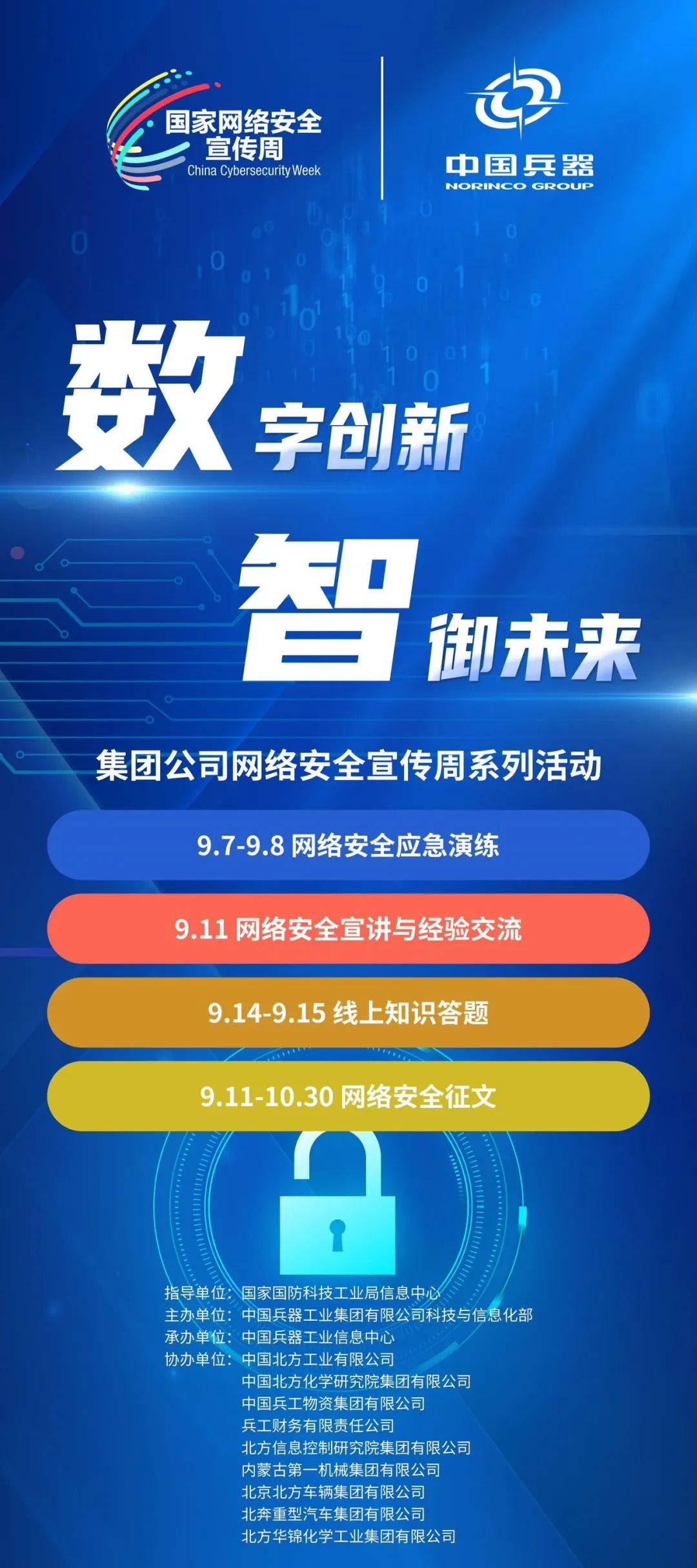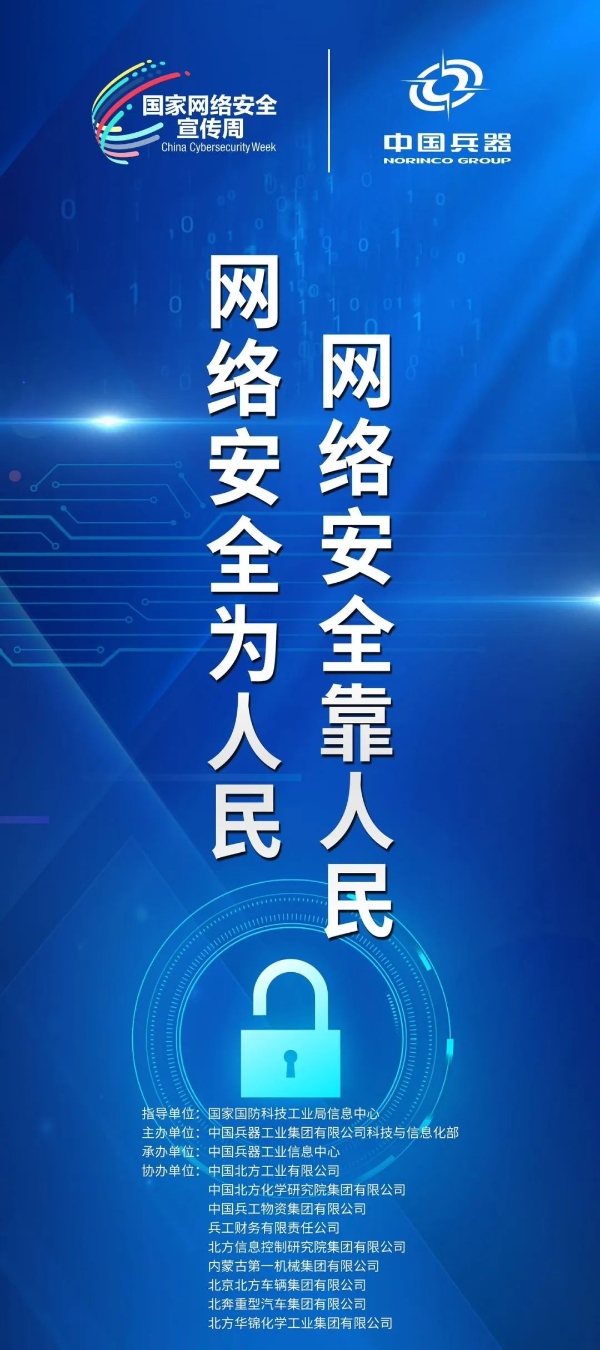 9月11日至17日,中國兵器工業(yè)集團(tuán)有限公司以“數(shù)字創(chuàng)新 智御未來”為主題,圍繞集團(tuán)公司“1+5”戰(zhàn)略和“雙十”規(guī)劃,組織開展集團(tuán)公司網(wǎng)絡(luò)安全宣傳周系列活動。 9月11日,集團(tuán)公司科技與信息化部組織在京單位召開網(wǎng)絡(luò)安全宣講與經(jīng)驗(yàn)交流活動,邀請公安部第一研究所網(wǎng)絡(luò)安全專家針對網(wǎng)絡(luò)安全形勢和個(gè)人防護(hù)技能以及網(wǎng)絡(luò)安全等級保護(hù)主要工作環(huán)節(jié)和標(biāo)準(zhǔn)應(yīng)用作專題講座,會上北方公司、物資集團(tuán)、財(cái)務(wù)公司、北方車輛集團(tuán)、北奔重汽進(jìn)行了工作經(jīng)驗(yàn)分享。